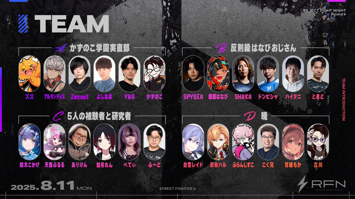 - REJECT FIGHT NIGHT Round6 スト6 優勝 【5人の被験者と研究者】 紡木こかげ(ディージェイ)/天鬼ぷるる(M:ジュリ)/ありけん(ダルシム)/如月れん(JP)/べてぃ(ジュリ)/ふ~ど(エド)