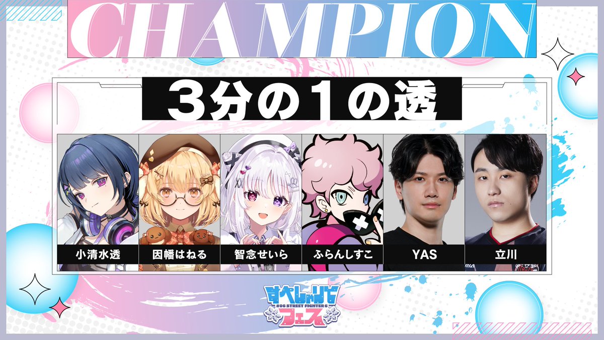 | 優勝 | 3分の1の透 | 小清水透(春麗)/因幡はねる(M:ブランカ)/智念せいら(M:エド)/ふらんしすこ(エド)/YAS(リュウ)/立川(マノン、C.ヴァイパー) |